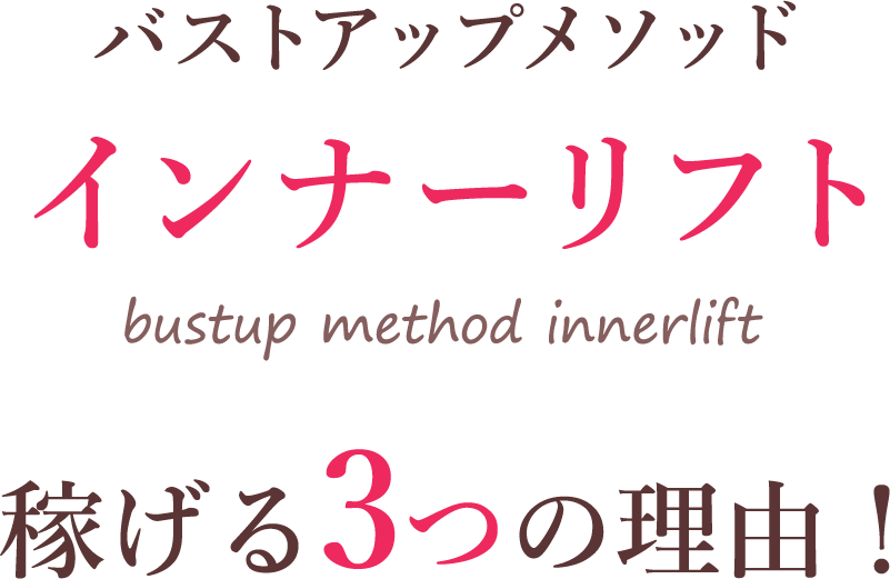 難しい理論は不要!営業力も要りません。バストアップメソッド「インナーリフト」は、ホームケアアイテムが自動的に売れる事まで仕組化した施術方法になります。