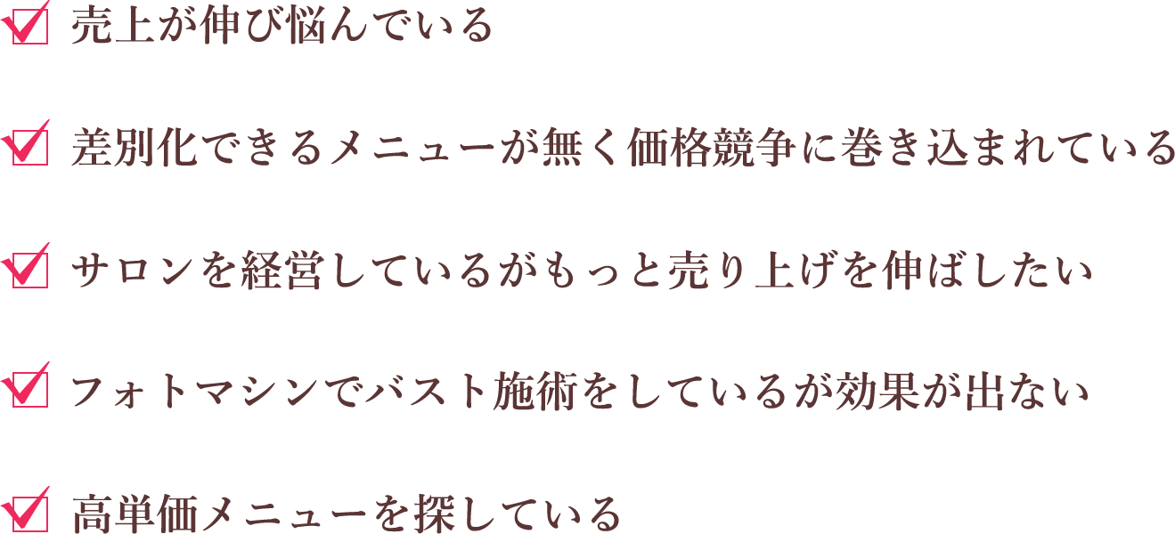 逆にエステ技術の取得に手間がかかるものは、ライバルが少なく、まさにブルーオーシャン状態!高単価メニューで強気の集客が出来ます。バストアップはライバルの少ない、稼げるメニューです。
