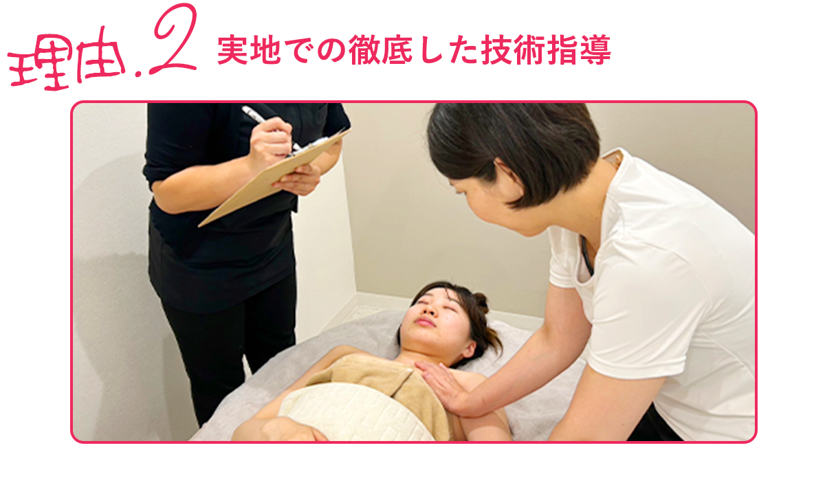 導入にあたっては、全国どこでも無償でサロンへ出向きマンツーマンでの実技指導を行います。他社ではリモートで完結するバストセミナーを開催しているところもありますが、当社のバストアップメソッドは技術が占める割合が高く、そのために重要なのが効果をもたらす「施術箇所」のピンポイント指導。よって実地でのトレーニングを行います。