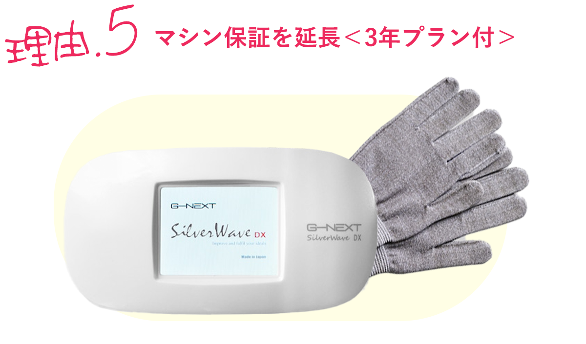 バストアップメソッド「インナーリフト」の要となる生体電流マシンは「日本エステサービス」社製。通常、保証1年のところ3年まで当社負担で延長。
