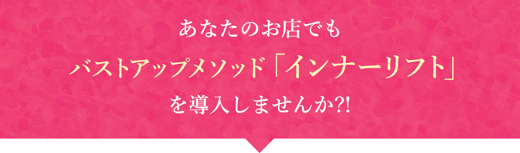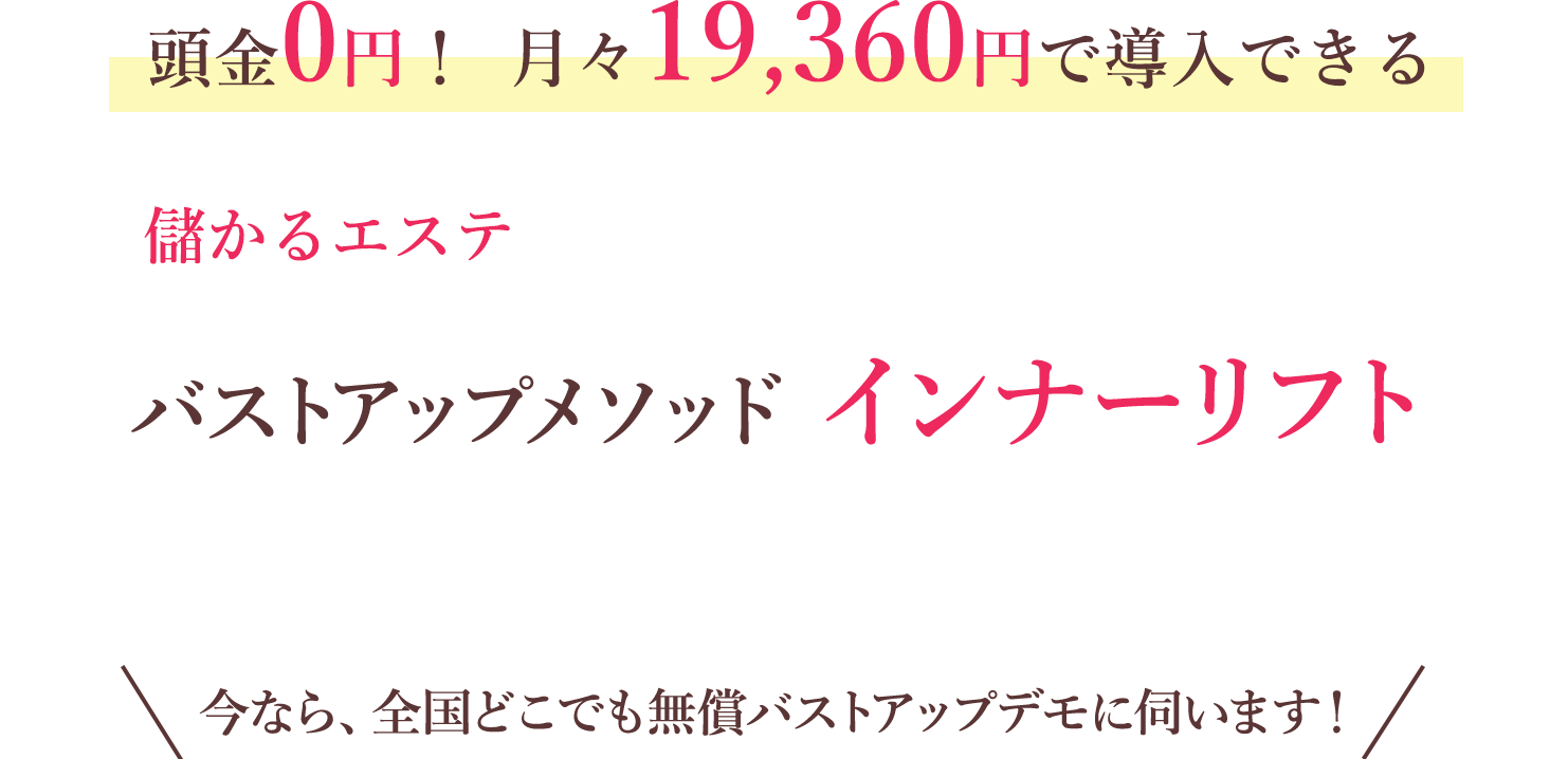 創立30年を超えるエステ業界の老舗メーカー「日本エステサービス」社と柔道整復師、美容専門学校講師のコラボにより開発されたバストアップ術「インナーリフト」は、バストアップの結果がケタ違いに出る・・・から、ユーザーの高いリピ率・回数券契約率を誇ります。